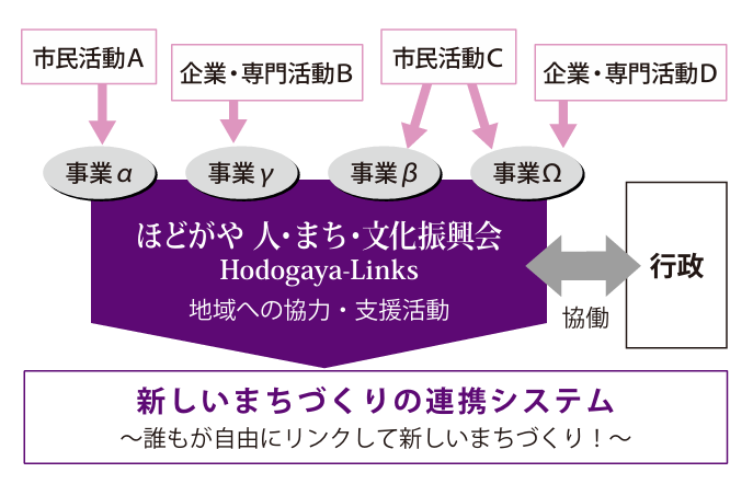 ほどがや 人・まち・文化振興会は、団体や個人が連携・協働・運営する、誰でも参加できるまちづくり共同体です。